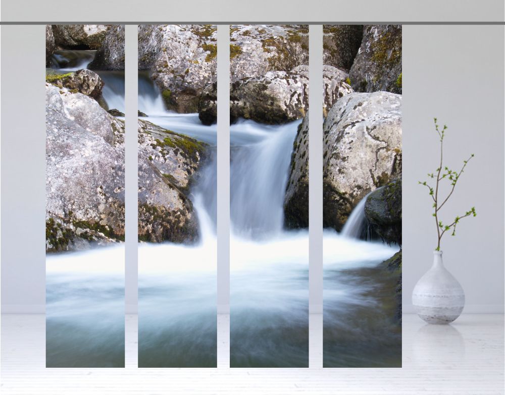 Durch mächtige Felsen bahnt sich ein reißender Gebirgsbach den Weg ins Tal. Ein einmaliger Flächenvorhang, auch Schiebegardine genannt. Das Motiv aus dem hohen Norden, aus Skandinavien, lädt zum verweilen ein. Hier kann man entspannen und ausruhen. Lassen Sie die satten Farben auf sich wirken. Rundherum ein Genuss und ein echter Gewinn für Ihre4 Wände.