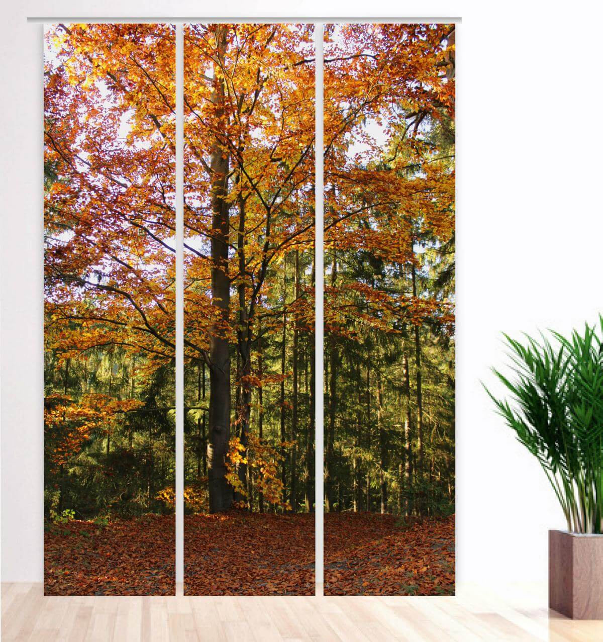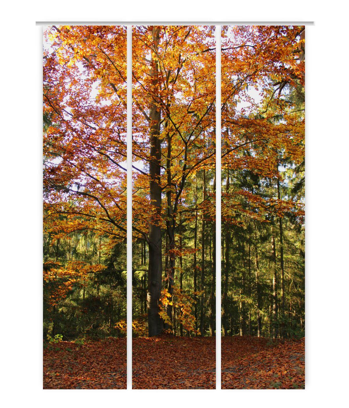 Welch ein wundervolles Motiv. Damit werden Sie Ihrer Wohnung einen echten Gefallen tun. Machen Sie diesen Flächenvorhang zu einem Teil Ihrer Wohnungseinrichtung. Als neue Fensterdekoration wird er komplett überzeugen. Ein Weg führt durch den bunt gefärbten Wald. Das herbstliche Motiv schafft eine traumhafte Atmosphäre in Ihren vier Wänden. Haben Sie bereits überlegt, wie dieses Motiv in Kombination mit Ihrer bestehenden Einrichtung wirken könnte? Es könnte eine harmonische Ergänzung sein, die den Raum mit Wärme und Farbe füllt. Wenn Sie weitere Informationen zu den verfügbaren Größen oder Materialien benötigen, zögern Sie bitte nicht, uns zu kontaktieren. Wir stehen Ihnen gerne zur Verfügung.