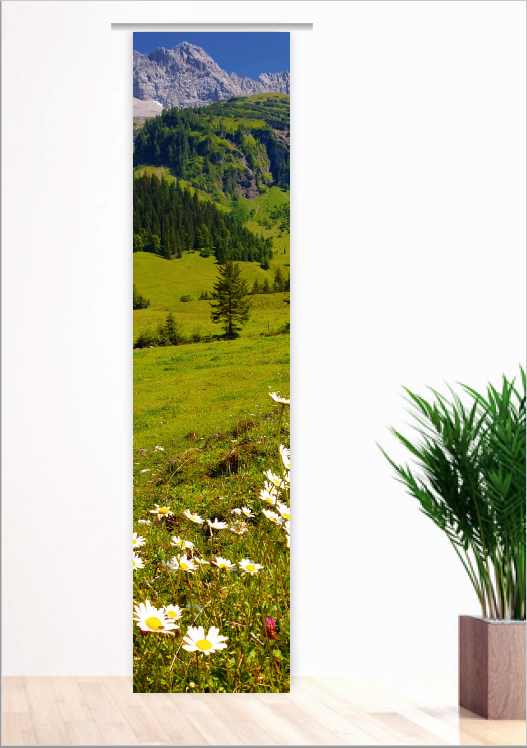 Vielleicht haben Sie ja auch schon über ein paar Veränderungen in Ihrer Wohnung nachgedacht, aber noch nicht die zündende Idee gehabt? Dann sind Sie in unserer eigenen Gardinen-Collektion Made in Thüringen absolut richtig. Hier finden Sie tolle Ideen rund um das Fenster. Probieren Sie sie aus, Sie werden bestimmt begeistert sein. Dieser außergewöhnliche Flächenvorhang sollte schon bald Teil Ihrer Wohnungseinrichtung sein. Ein wunderschönes Motiv schmückt das Exemplar. Die Natur in all ihrer Schönheit kommt hier zum tragen. Eine blühende Wiese, Bäume, sattes Grün und im Hintergrund die grauen, massiven Felsen der Alpen und das Blau des Himmels. Sag, Herz, was willst du mehr?