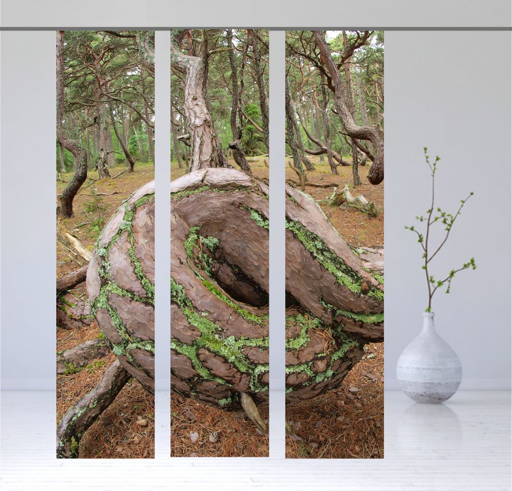 Hier finden Sie einen wunderschönen Flächenvorhang aus der 3er Serie "Zauberwald". Das Motiv, inspiriert von den Landschaften des hohen Nordens Skandinaviens, lädt zum Verweilen ein. Ein urwüchsiger Wald mit verschlungenen Bäumen prägt das Bild und schafft eine Atmosphäre, die perfekt zum Abschalten und Ausruhen geeignet ist. Lassen Sie die beeindruckenden Farben auf sich wirken. Dieser Flächenvorhang ist rundherum ein Genuss und ein echter Hingucker für Ihren Wohnraum.