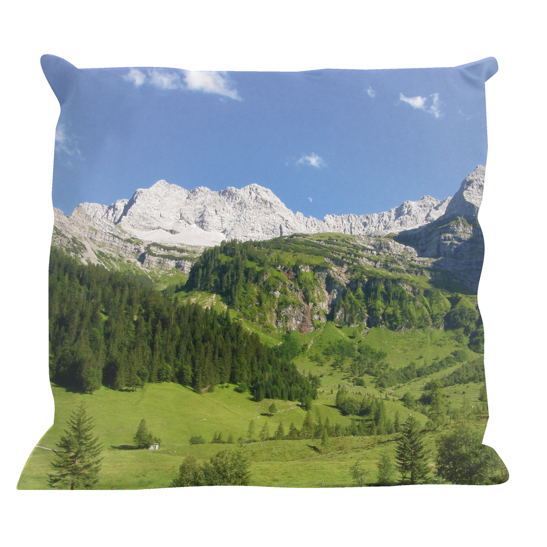 Genial kann man hier einfach nur sagen. Dieser Blick fasziniert wohl jeden Betrachter. Hier kommt die Weite der Landschaft hervorragend zur Geltung. Das weite Tal im Vordergrund wird von den mächtigen Felsmassiven der Berge umrahmt. Grün sind die Wiesen und Bäume, der Himmel ist blau. Der Sommer läßt grüßen. Dieses tolle Naturmotiv ziert eine Kissenhülle aus unserer thüringischen Gardinen-Collektion und sollte schon bald Teil Ihrer Wohnlandschaft werden. Damit kommen neue Farben und ein neues Motiv in den Wohnraum und die Natur hält ebenfalls Einzug. Das wird Ihren Wohnraum nachhaltig verändern und eine tolle Atmosphäre darin erzeugen.