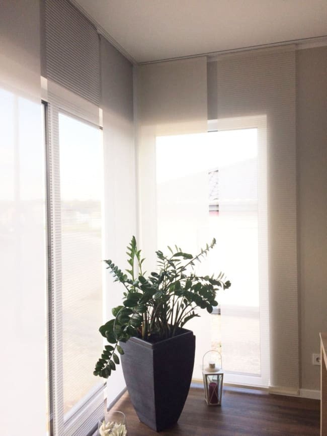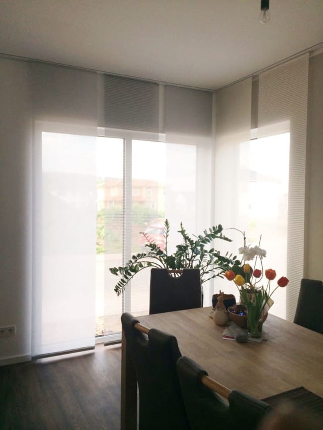 Die Panelo Flächenvorhänge eignen sich, wie Sie auf den Bildern sehen können besonders gut für einen modernen Wohnstil, wie z.B. Neubauten. Die Panelo Flächenvorhänge sind besonders gut kombinierbar und passen auch zu Einfarbigen, vollfarbigen Flächenvorhängen. Wie man auf dem Bildern unserer Kundin sehen kann nehmen sie von außen die Sicht und lassen trotzdem Licht in die Wohnung.