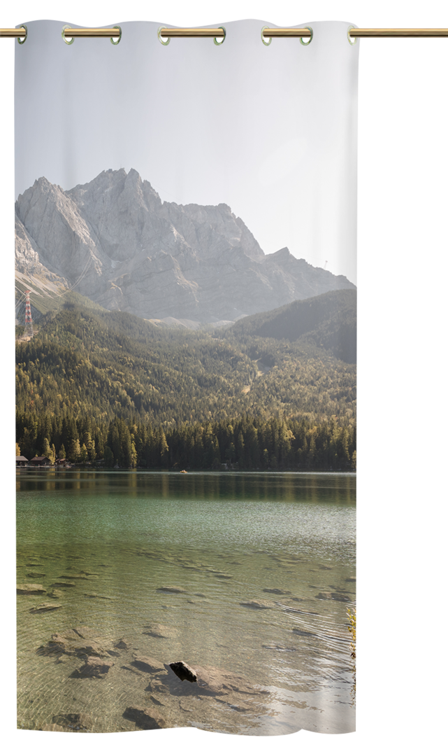 Ohne ein paar Veränderungen könnte Ihre Wohnung an Attraktivität einbüßen. Das sollten sie nicht zulassen. Bringen Sie neue Farben und Motive in den Wohnraum. Diese werden ihn nachhaltig und grundlegend verändern. Eine neue Fenster-Dekoration wird ein perfekter Anfang für weitere Veränderungen sein. In unserer eigenen Gardinen-Collektion Made in Thüringen finden Sie tolle Ideen rund um das Fenster. Dieser hochklassige Ösenschal könnte schon bald eines Ihrer Fenster schmücken. Ein toller Blick weitet sich vom kristallklaren Wasser im Vordergrund auf die kahlen Berge im Hintergrund. Wälder ziehen sich am Fuße der Berge hin und tauchen das Bild in ein frisches Grün.