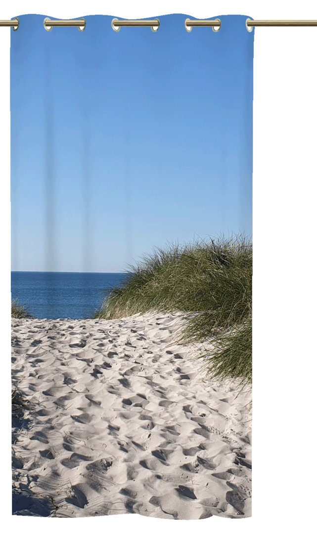 Vielleicht haben Sie ja auch schon über ein paar Veränderungen in Ihrer Wohnung nachgedacht, aber noch nicht die passende Idee gehabt? Dann sind Sie in unserer thüringischen Gardinen-Collektion mit Sicherheit richtig. Hier finden Sie alles rund um das Fenster. Da sollte auch für Sie etwas Passendes dabei sein. Dieser grandiose Ösenschal holt die Natur in Ihre 4 Wände. Welch beeindruckender Blick. Der Weg über die Düne führt an die offene See. Der Blick auf das weite Meer bis auf den Horizont ist überwältigend. Da möchte man einfach nur hinschauen und träumen. Dann träumen Sie doch einfach vom kommenden Urlaub. Ihrer Wohnung wird das sicherlich gut tun.