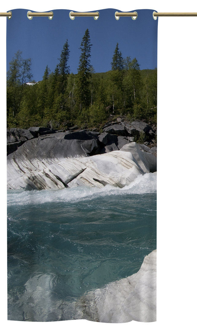 Gebirgswasser schlängelt sich ins Tal, vorbei an Kiefern und Felsen - ein faszinierendes Bild und prächtiges Motiv für diesen wunderschönen Ösenschal. Lassen Sie sich verzaubern von der wilden NAtur des Nordens.