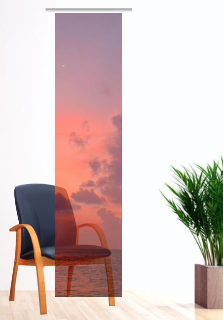 Mehr Flexibilität bei der Dekoration der Fenster. Für diesen Zweck bietet sich ein Flächenvorhang an, großzügig in den Dimensionen, durchsichtig, mit Motiv oder unifarben. Große Flächen beeindrucken und wecken erwiesenermaßen die Neugierde und wirken sich nachhaltig das Ambiente eines Raumes aus. Sei es ein exotisches Strandmotiv wie zum Beispiel von den Malediven, ein romantischer Sonnenuntergang mit kräftigen und warmen Farben oder schlicht und einfach ein unifarbener Flächenvorhang, ganz in Lila, das einen starken Akzent setzt. Wichtig ist, dass der Vorhangstoff transparent ist. Einerseits, um den Raum nicht zu stark abzudunkeln und andererseits, um das Purpur ins richtige Licht zu setzen.