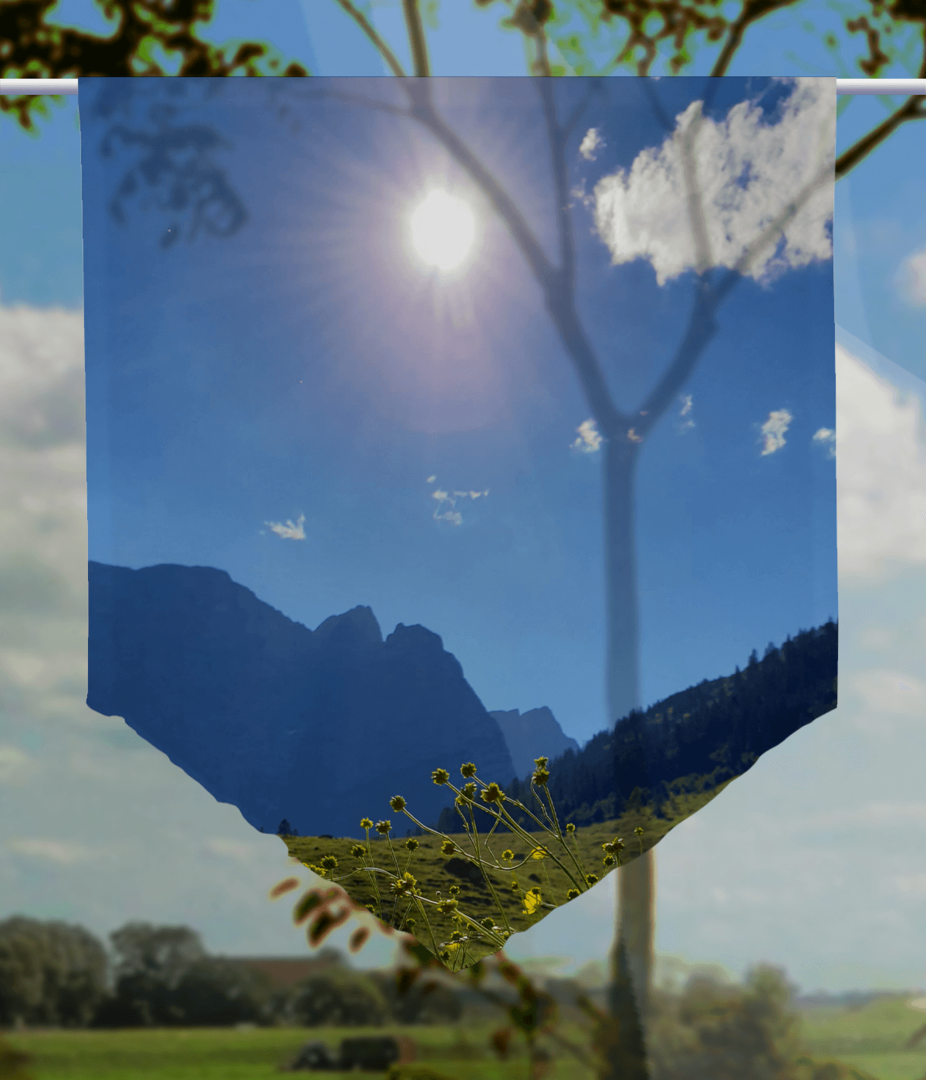 Als neue Fenster-Dekoration könnte dieser einzigartige Scheibenhänger aus unserer hauseigenen Gardinen-Collektion bestimmt Eindruck machen. Sein gelungenes Naturmotiv aus den Alpen fängt den Blick des Betrachters schnell ein. Alpenblumen stehen auf einer Bergwiese. Die gelben Blüten bringen Farbe ins Bild. Im Hintegrund erheben sich die massiven Felswände der Berge, die majestätisch in den Himmel ragen. Die Sonne taucht alles in ein strahlendes Licht. Holen Sie sich dieses Stück Natur in Ihrer Wohnung. Die neuen Farben und das Motiv werden Ihren Wohnraum nachhaltig verändern. Eine tolle Atmosphäre wird entstehen, in der Sie sich bestimmt sehr wohlfühlen werden.