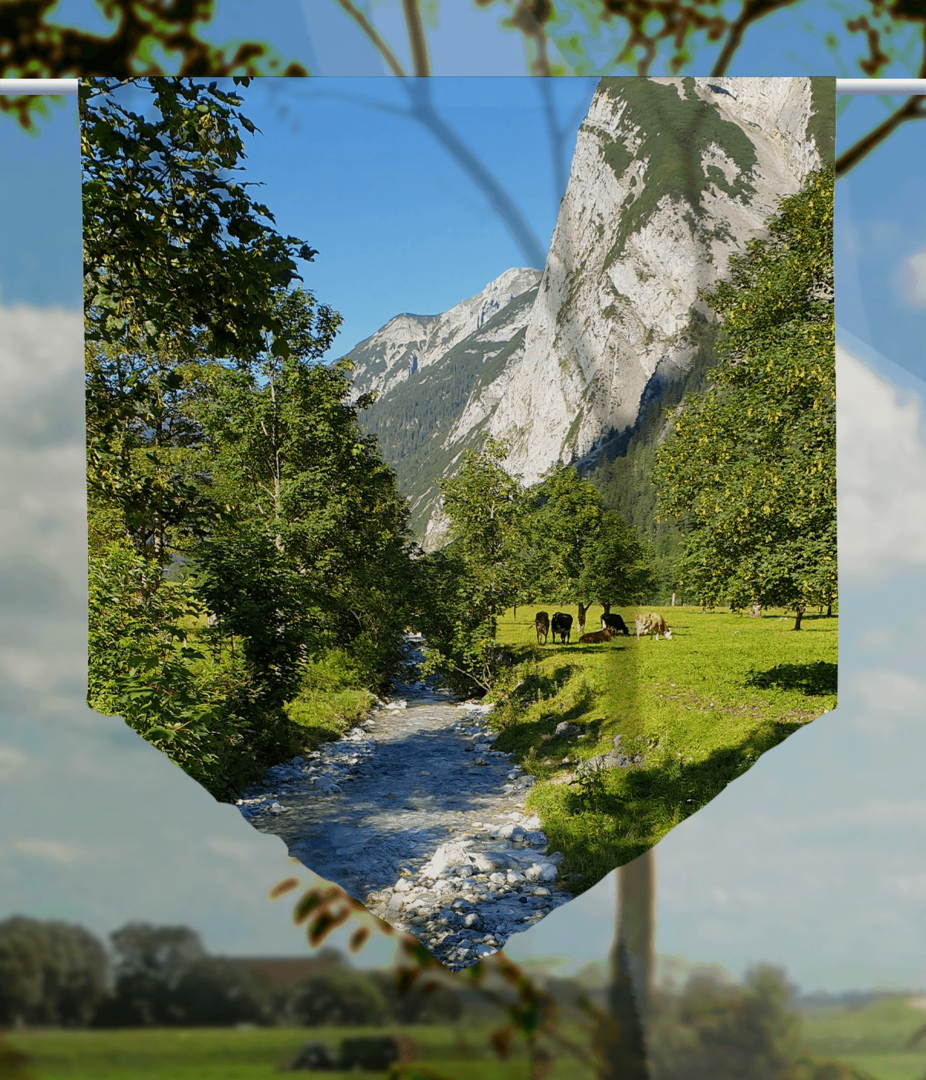 Etwas neue Farbe und ein paar neue Motive, und schon könnte Ihre Wohnung in neuem Glanze erstrahlen. Mit einer neuen Fenster-Dekoration könnten Sie das schnell und einfach umsetzen. Schauen Sie sich in unserer eigenen Gardinen-Collektion Made in Thüringen einmal um, hier finden Sie alles rund um das Fenster. Da ist bestimmt auch etwas für Ihre Wohnung und Ihren Geschmack dabei. Dieser beeindruckende Scheibenhänger wird bestimmt ein Volltreffer werden. Das Alpenmotiv ist wunderbar. Ein kleiner Gebirgsbach fließt an einer Alm entlang. Kühe grasen unter grünen Bäumen. Im Hintergrund erheben sich die Felsen der Bergmassive. Das ist einfach perfekt.