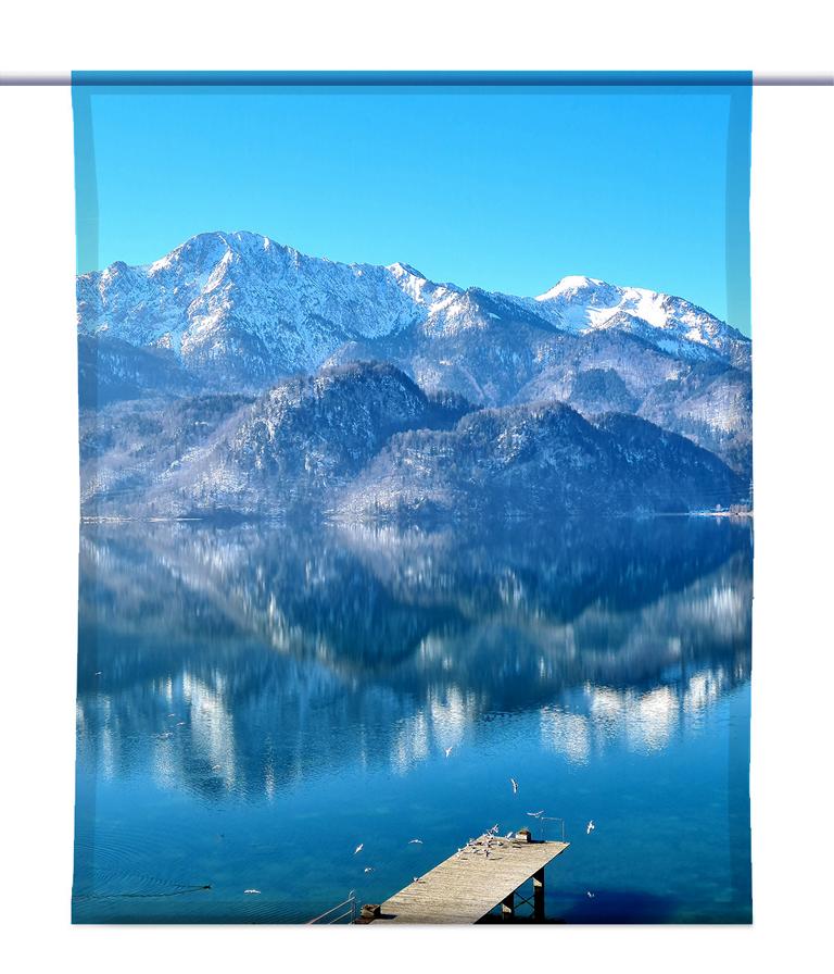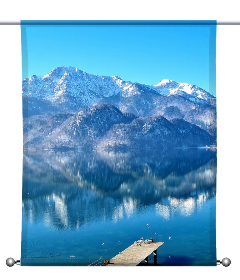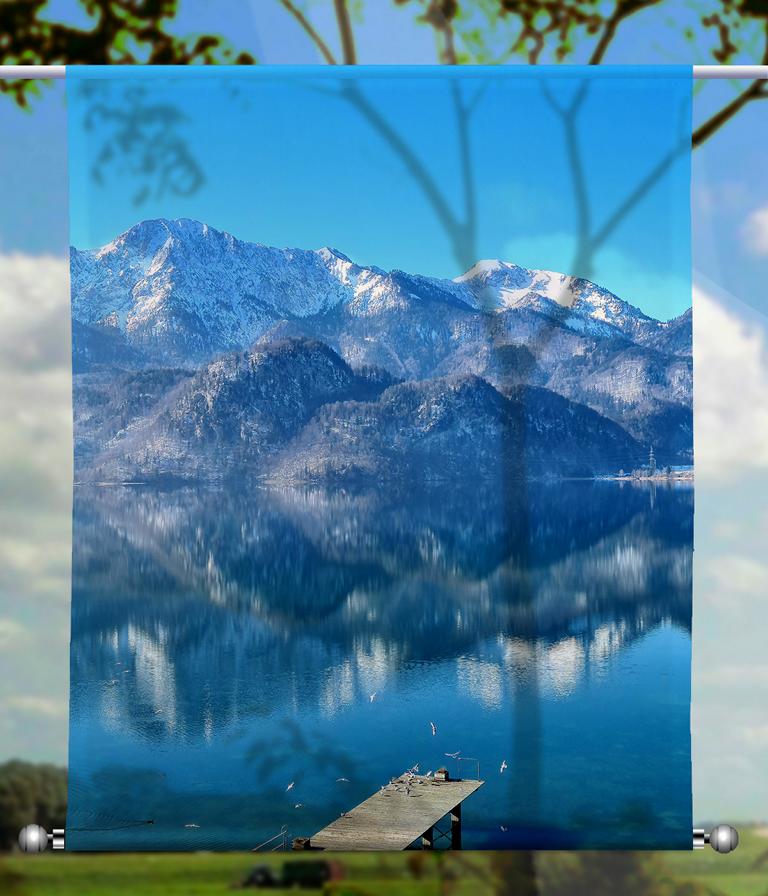 Mit diesem Motiv werden Sie im wahrsten Sinne des Wortes Ihr blaues Wunder erleben. Ein einzigartiges Bild ziert diesen Scheibenhänger, der als neue Fensterdekoration Ihre Wohnung verschönern wird. Der Blick über den See auf die Gipfel der Berge im Hintergrund ist atemberaubend. Das Licht taucht alles in eine bläuliche Farbe.