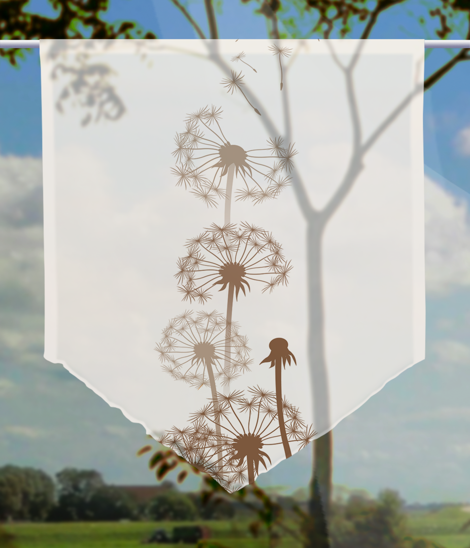 Charakteristisch für eine Wohnung sind in der Regel ihre Gardinen. Sie bestimmen mit ihren Farben und Motiven das Gesicht einer Wohnung. Haben Sie Lust auf ein paar Veränderungen in Ihrer Wohnung, dann fangen Sie hiermit am besten an. In unserer hauseigenen Gardinen-Collektion aus Thüringen finden Sie tolle Ideen rund um das Fenster, die Sie alle umsetzen können. Dieser wunderbare Scheibenhänger wird betimmt ein Hingucker in Ihrer Wohnung werden Sein schönes Naturmotiv ist wahrlich gelungen. Pusteblumen bestimmen das Bild und wecken auch in Ihnen Erinnerungen an frühere Zeiten. Cappuccino-Farbtöne machen das Ganze rund und passen sich perfekt ein.