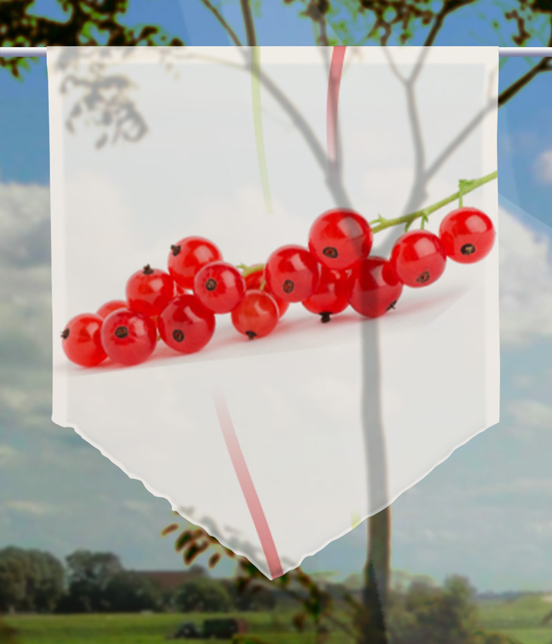 Na was halten Sie denn von ein paar Veränderungen in Ihrer Wohnung? Wäre das nicht wiedermal an der Zeit? Damit könnten Sie Ihre Wohnung wieder in Schwung bringen. Neue Farben und Motive sind die Zauberwörter. Mit einer neuen Fenster-Dekoration können Sie sich beides schnell und einfach in Ihre Wohnung holen. Dieser bezaubernde Scheibenhänger aus unserer hauseigenen Gardinen-Collektion aus Thüringen besticht durch sein erfrischendes Früchtemotiv. Rote Johannesbeeren schmücken das Bild und holen ein Stück Natur in Ihre Wohnung. Das Rot kommt auf dem weißen Hintergrund bestens zur Geltung. Ein Anblick, an dem Sie Ihre Freude haben werden.