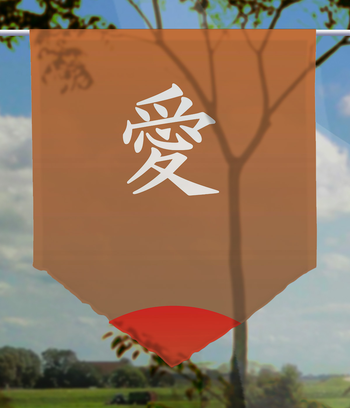 Probieren Sie es aus. Neue Farben und Motive verändern einen Wohnraum grundlegend und nachhaltig. Dazu nutzen Sie am besten eine neue Fensterdekoration, denn mit ihr kommt beides schnell und einfach in den Wohnraum. Dieser überzeugende Scheibenhänger wird ein Hingucker werden. Sein Kunstmotiv ist großartig. Ein großes, japanisches Schriftzeichen in weißer Farbe leuchtet auf dem braunen Untergrund mit der aufgehenden Sonne.