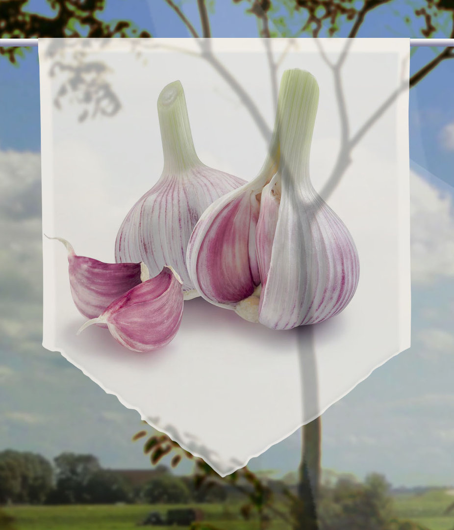Sie wollen Ihre Küche ein wenig aufpeppen? Warum nicht! Wie wäre es mit einem Scheibenhänger für ihr Küchenfenster? Aus unserer eigenen Produktion ist dieser Scheibenhänger ein besonders beliebtes Stück aus unserer Gardinen-Collection. Die überdimensionalen Knoblauchzwiebeln machen Lust auf ein schmackhaftes Essen, so richtig für den Liebhaber deftiger Speisen. Machen Sie mit diesem perfekten Scheibenhänger ihre Küche zu einem echten Lieblingsort in Ihrer Wohnung und zu einem Blickfang für jeden Betrachter. Sie sollten nicht lange überlegen, denn mit diesem Scheibenhänger werden Sie nicht nur die Küche sondern die gesamte Wohnung perfektionieren.