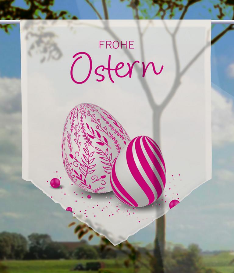 Was halten Sie denn von einem Farb- und Motivwechsel in Ihrer Wohnung? Wäre das nicht wiedermal an der Zeit? Die kommende Osterzeit lädt buchstäblich dazu ein. Eine neue Fensterdekoration schafft das spielend und schnell. Dieser außergewöhnliche Scheibenhänger wird bestimmt ein Blickfang in Ihrer Wohnung werden. Große, kunstvoll verzierte Ostereier in Magentafarbe, leuchten auf dem weißen Untergrund.