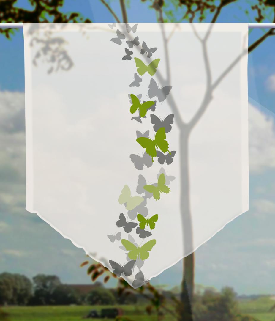 Jetzt wird es aber höchste Zeit für einen Farb- und Motivwechsel in Ihrer Wohnung. Holen Sie sich mit diesem bezaubernden Scheibenhänger ein Stück Natur in Ihre 4 Wände. Lassen Sie diesen Schmetterlingsschwarm durch Ihren Wohnraum fliegen. Er wird Frische und Lebendigkeit hineinbringen. Die grüne Farbe gibt dem Ganzen einen schönen Charakter. Durch neue Farben und neue Motive werden Sie so Ihren Wohnraum wieder wohnlicher und schöner machen. Als neue Fenster-Dekoration wird er eine tolle Atmosphäre darin erzeugen, in der Sie sich wohlfühlen werden. Schauen Sie sich auch weiterhin in unserer hauseigenen Gardinen-Collektion aus Thüringen um. Sie werden viele Ideen finden.