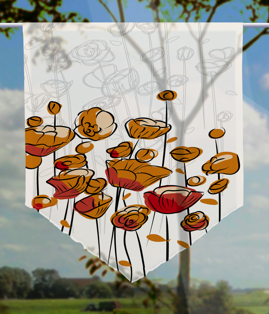 Was halten Sie denn von einem Farb- und Motivwechsel in Ihrer wohnung? HAben Sie auch schon daran gedacht? Dann wollen wir mit unserer eigenen GArdinen-Collektion Made in thüringen Ihnen helfen, das Richtige für IHre Wohnung und für IHren GEschmack zu finden. Mit einer neuen Fenster-Dekoration werden Sie Ihrer Wohnung ein neues GEsicht geben. Fangen Sie also am besten damit an. Dieser einmalige Scheibenhänger wird bestimmt ein Volltreffer für IHre Wohnung werden. Mit seinem abstrakten Naturmotiv holt es diese direkt in Ihre 4 Wände. Das gelungene Blütenmotiv erfüllt den Wohnraum und sorgt für eine angenehme Atmosphäre, die durch die warmen Pfefferfarben noch unterstützt wird.