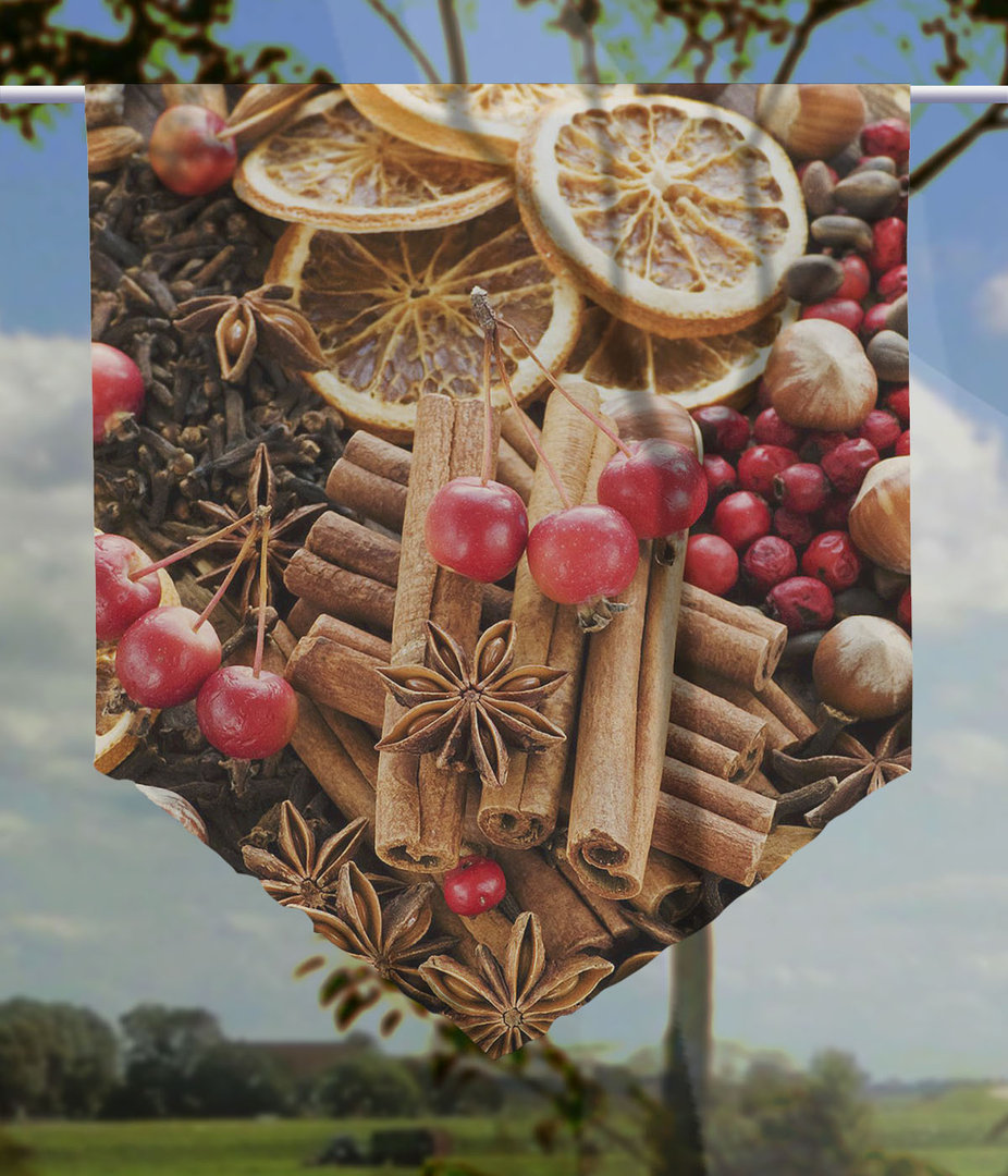 In ihrer Küche fehlt noch das gewiise Etwas? Sie sind schon lange aufder Suche, aber noch nicht fündig geworden? Dann sind Sie hier absolut richtig. In unserer hauseigenen Produktionsserie der GArdinen-Collection werden Sie das Richtige finden. Schauen Sie sich diesen wundervollen Scheibenhänger in Ruhe an? Würde er nicht hervorragend passen. Verschiedene Gewürze wie Zimt, Zitronen und verschiedene andere Dinge bilden ein wunderschönes Ensemble und das Motiv dieses faszinierenden Scheibenhängers. Jeder wird Sie um diesen Scheibenhänger beneiden. Er wird ein echter Hingucker in Ihrer Küche werden und Sie werden wieder Freude an der Küchenarbeit finden - bestimmt!