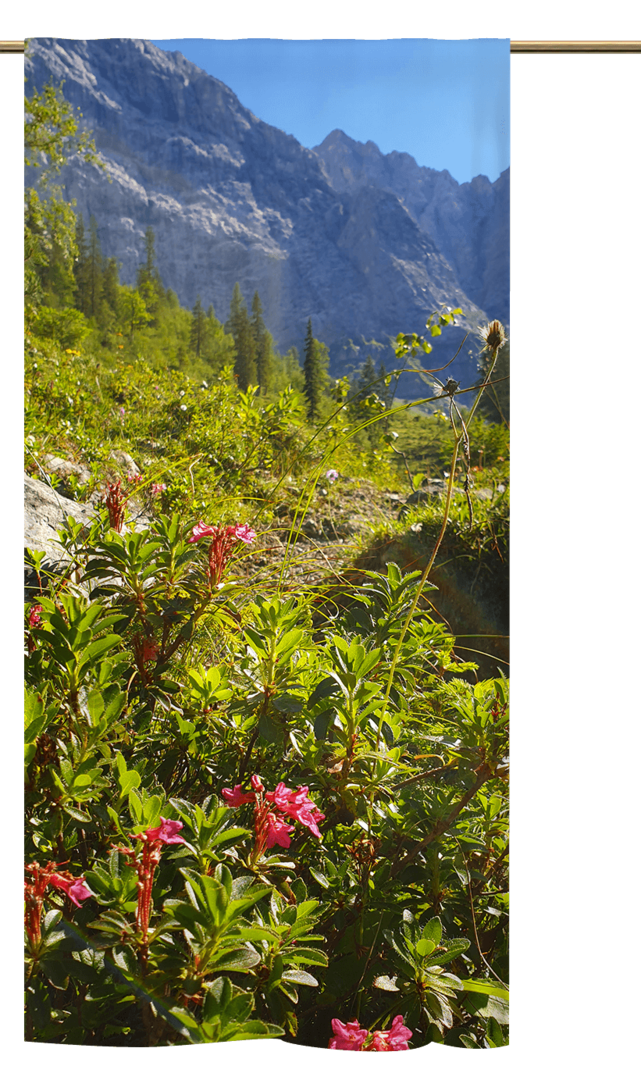 Zeit um Ihre Wohnung wieder auf Vordermann zu bringen. Bringen Sie mit einer neuen Fenster-Dekoration neue Farben und Motive in den Wohnraum, diese werden ihn nachhaltig verändern. Dieser spitzenmäßige Schlaufenschal aus unserer thüringischen Gardinen-Collektion wird die Natur in Ihre Wohnung bringen. Ein tolles Motiv ziert dieses Exemplar. Gebirgsblumen blühen an einem Bergpfad. Das Rot der Blüten sind Farbtupfer in der grünen Vegetation. Im Hintergrund ragen die mächtigen Felsmassive der Alpen in den blauen Himmel. Der Weg lädt zu einem Spaziergang ein. Mit diesem Schlaufenschal schaffen Sie sich ein neues Highlight in Ihrer Wohnung, das viele begeistern wird.