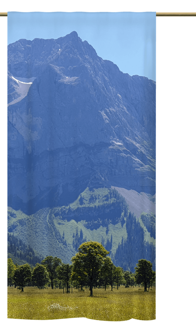 Was halten Sie denn von ein paar Veränderungen in Ihrer Wohnung? Wäre dafür nicht wieder einmal Zeit? Sollten Ihnen die Ideen fehlen, dann schauen Sie sich in aller Ruhe in unserer hauseigenen Gardinen-Collektion aus Thüringen um. Hier werden Sie bestimmt etwas Passendes für Ihre Wohnung und für Ihren Geschmack finden. Dieser wunderschöne Schlaufenschal wird als neue Fenster-Dekoration bestimmt überzeugen. Die Natur kommt direkt in Ihre Wohnung. Das Motiv aus den Alpen in sehenswert. Bäume in sattem Grün stehen auf einer Wiese. Im Hintergrund erheben sich die mächtigen Bergmassive der Alpen in den blauen Himmel. Ein perfektes Farbensemble und ein tolles Panorama.