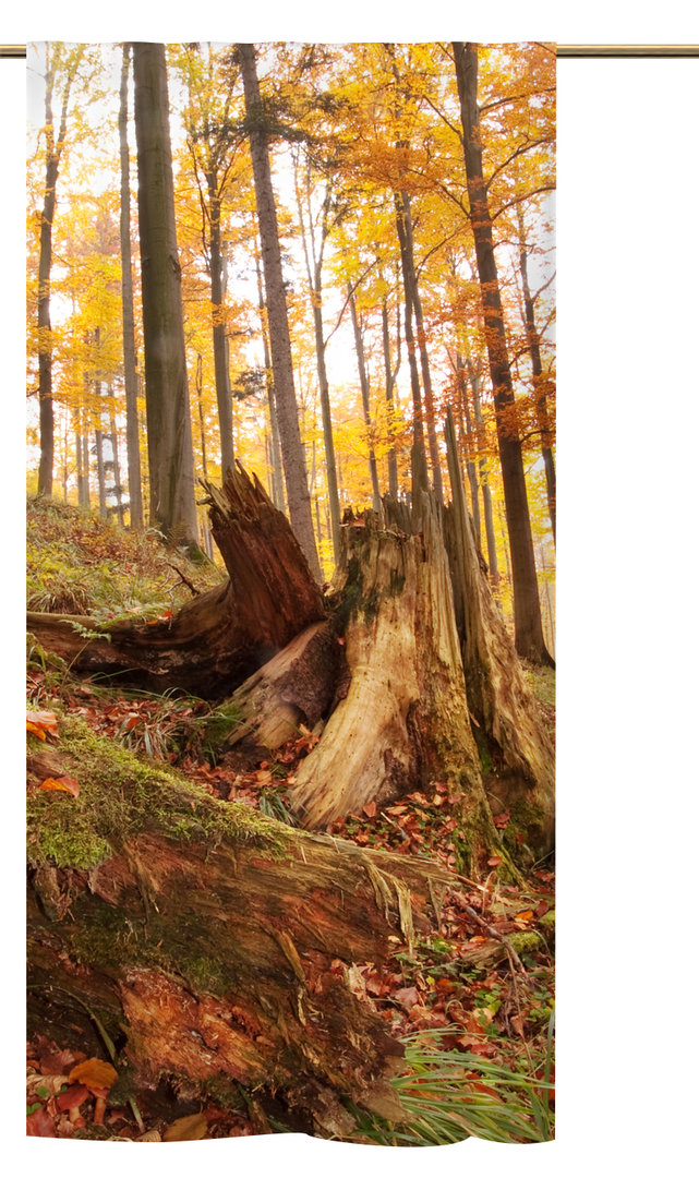 Dieses atemberaubende Motiv der großen Baumstümpfe inmitten des herbstlich gefärbten Waldes zieht automatisch die Blicke auf sich und wird als neue Fenstr-Dekoration in Ihrer Wohnung ebenso ein Hingucker werden. Der Schlaufenschal aus unserer thüringischen Gardinen-Collektion ist ein Muss für Ihre Wohnungseinrichtung.