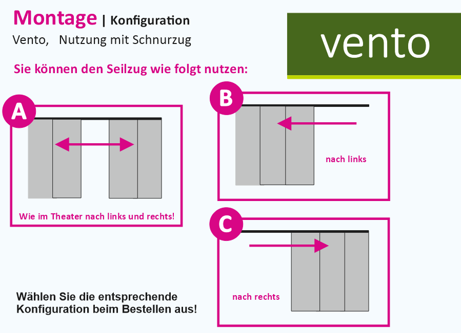 D.h. Sie können mit einem Schnurzug das Flächenvorhangset auf die gewünschte Seite aufziehen bzw. schließen.