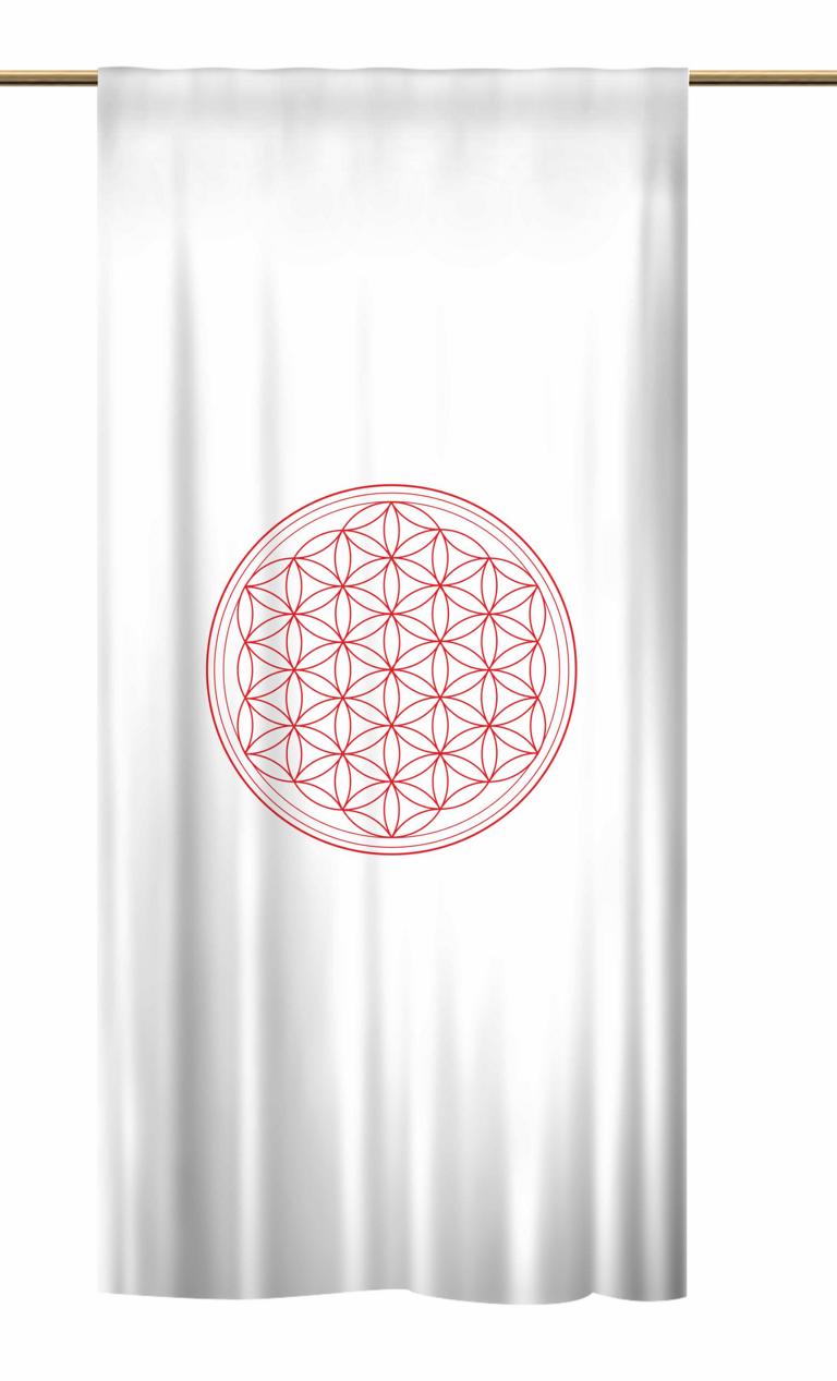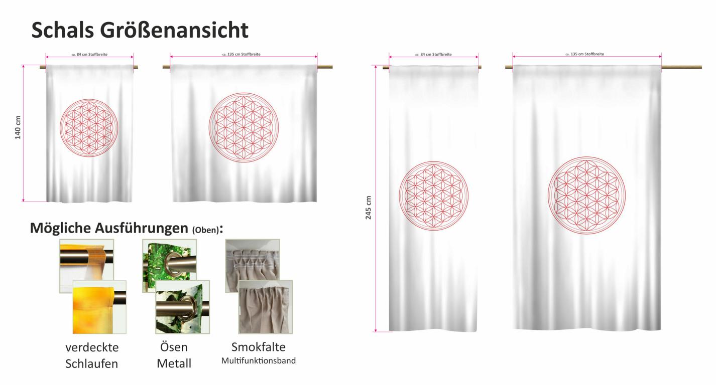 Der Blume des Lebens Vorhangschal in leuchtendem Rot ist nicht nur ein Hingucker, sondern auch ein echtes Statement für jeden modernen Wohnstil. Dieses Design vereint zeitgemäße Ästhetik mit harmonischen Symbolen und sorgt für eine einladende Atmosphäre in Ihrem Zuhause. Der Vorhang ist in verschiedenen Variationen erhältlich: als Ösenschal, der sich elegant über eine Stange ziehen lässt, oder als Schlaufenschal mit verdeckten Schlaufen, der einen cleanen Look bietet. Zudem können Sie zwischen einem klassischen Schal mit Saum oben und einem praktischen Schal mit Multifunktionsband wählen, der sich problemlos an Ihre individuellen Bedürfnisse anpassen lässt.