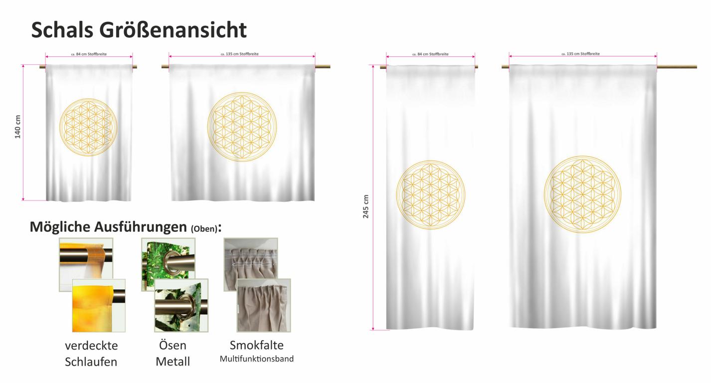 Der Vorhangschal mit dem gelben Motiv der "Blume des Lebens" bringt frische Farbe und moderne Eleganz in Ihr Zuhause. Dieses zeitgemäße Design harmoniert wunderbar mit einem modernen Wohnstil und setzt lebendige Akzente in Ihrem Wohnraum. Egal, ob Sie ihn als Ösenschal, Schlaufenschal mit verdeckten Schlaufen oder mit einem Multifunktionsband wählen, dieser Vorhang ist äußerst vielseitig und passt sich Ihren individuellen Bedürfnissen an. Die speziellen Saum-Designs sorgen dafür, dass der Schal nicht nur ästhetisch ansprechend ist, sondern auch optimal in Ihre Fensterdekoration integriert werden kann. Unser Vorhang ist in verschiedenen Transparenzstufen erhältlich: von blickdicht, ideal für mehr Privatsphäre, über transparent, das sanftes Licht hereinlässt, bis hin zu einem praktischen Blackout-Stoff, der störende Lichtquellen vollständig blockiert. Hergestellt in Deutschland, überzeugen unsere Vorhänge durch ihre hervorragende Verarbeitung und Langlebigkeit. Verleihen Sie Ihrem Raum mit diesem stilvollen Vorhangschal ein neues, lebendiges Ambiente und genießen Sie die harmonische Ausstrahlung der Blume des Lebens in Ihrer Einrichtung!