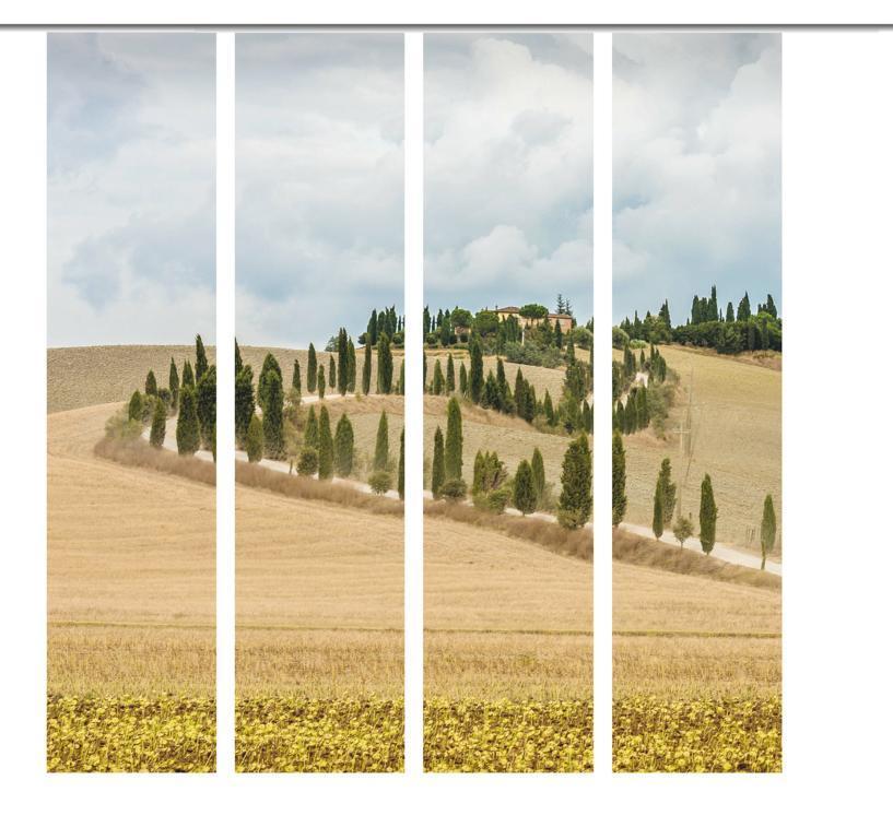 Das Gewebe des Flächenvorhangs besteht zu 100% aus Polyester. Der Druck erfolgt im Sublimationsverfahren und garantiert somit ein Maximum an Langlebigkeit.